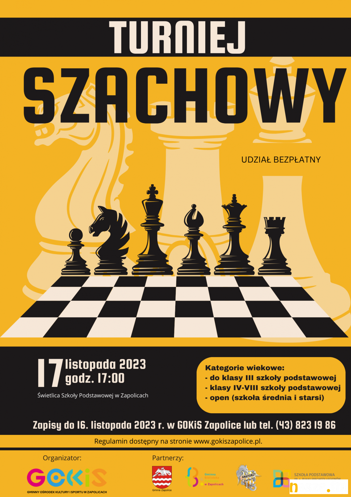 17 listopada w Szkole Podstawowej w Zapolicach odbędzie się Turniej Szachowy. Trwają zapisy.