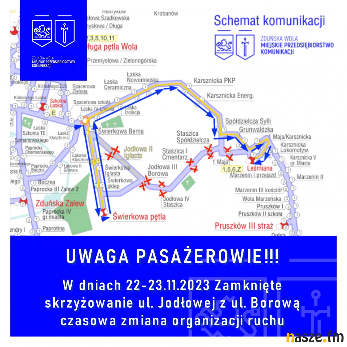 Nieczynne będą przystanki: Jodłowa/Borowa, Jodłowa/Staszica, Staszica/Cmentarz, Staszica/Spółdzielcza, 1 Maja oraz przystanki zastępcze: Staszica/Poprzeczna i Leśmiana/Spółdzielcza.