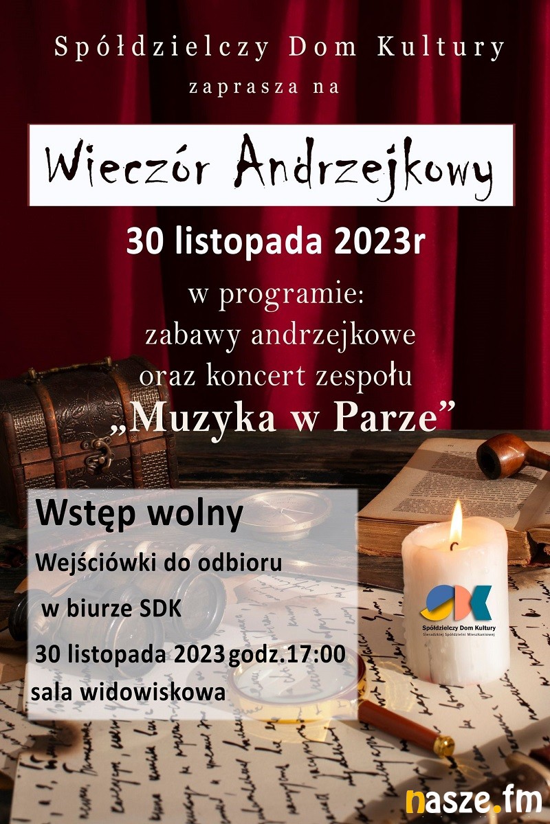 Niektórzy na ten wieczór czekają cały rok. Mowa o wieczorze andrzejkowym. Na takie wydarzenie zaprasza 30 listopada Spółdzielczy Dom Kultury w Sieradzu. W programie m.in. koncert zespołu Muzyka w parze, potańcówka i wróżby.