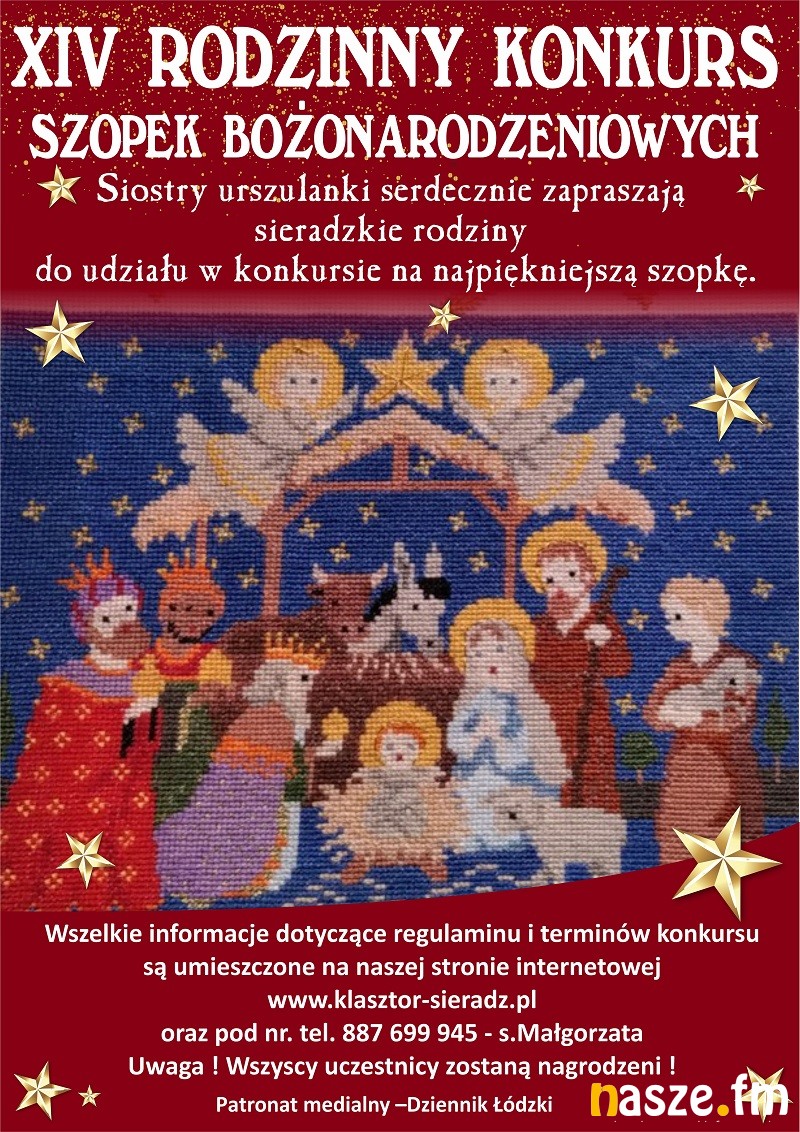 Zgromadzenie Sióstr Urszulanek SJK w Sieradzu zaprasza do udziału w czternastym konkursie Szopek Bożonarodzeniowych. Konkurs adresowany jest do rodzin parafii sieradzkich i terenu powiatu sieradzkiego. Szopki mogą być wykonane w dowolnej technice i dowolnych rozmiarach. Mile widziane nawiązanie do tradycji lokalnej, historii, strojów czy miejscowej architektury. Prace należy dostarczyć do 24 grudnia.