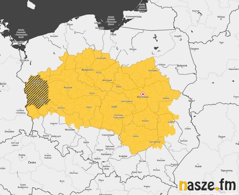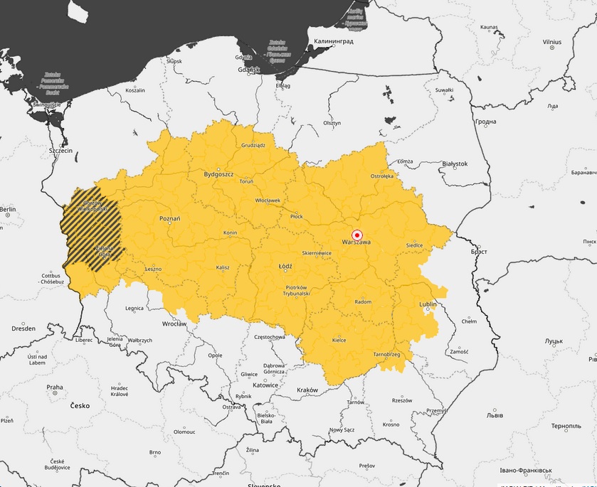 Synoptycy z IMGW wydali dla Łódzkiego ostrzeżenie pierwszego, czyli najniższego stopnia. Na mapie poniżej kolorem żółtym zaznaczono obszar naszego kraju, którego dotyczy to ostrzeżenie.