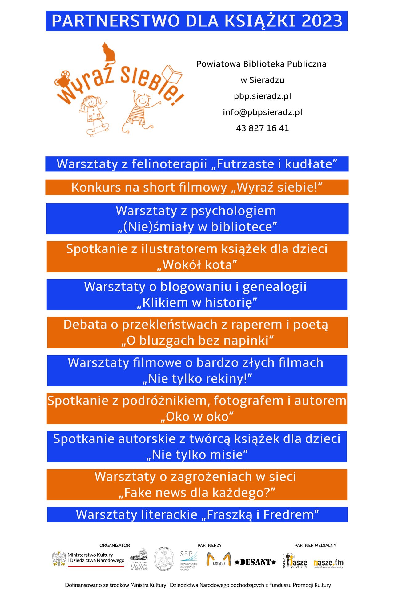 Na realizację projektu „Wyraź siebie!” PBP w Sieradzu otrzymała w 2023 roku dofinansowanie Ministra Kultury i Dziedzictwa Narodowego w wysokości 14 288 zł w ramach programu "Partnerstwo dla książki 2023”.