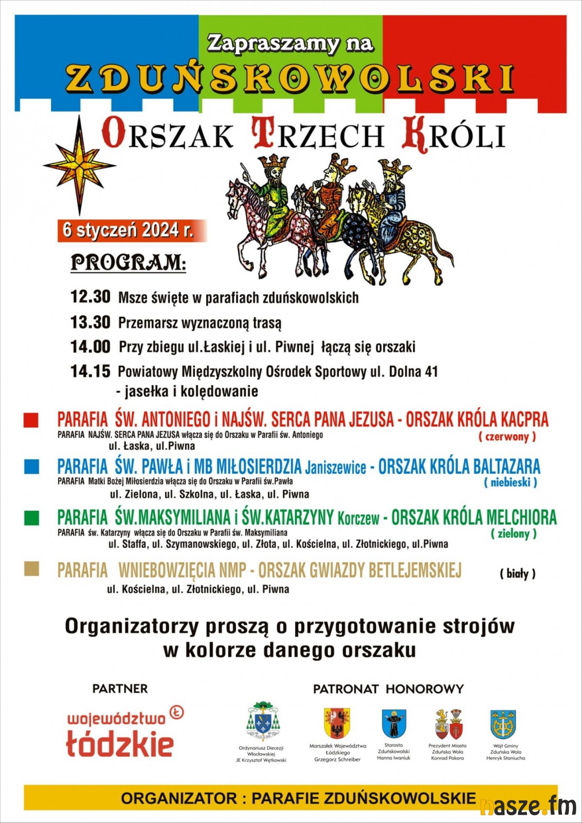 Do udziału w IX Orszaku Trzech Króli w Zduńskiej Woli zapraszają zduńskowolskie parafie oraz te w Janiszewicach i Korczewie. Przed wymarszem wierni spotkają się na nabożeństwach w kościołach o godzinie 12:30. Po mszach z każdej parafii wyruszy orszak w innym kolorze:- Parafia św. Antoniego w Zduńskiej Woli - czerwony orszak króla Kacpra (do tego orszaku dołącza parafia Najświętszego Serca Pana Jezusa w Zduńskiej Woli Karsznicach).