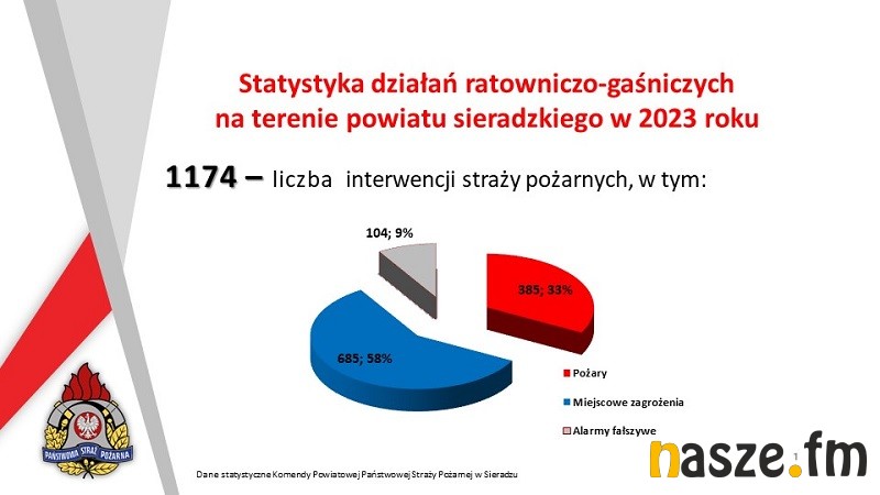 W powiecie sieradzkim w roku 2023 odnotowano 1174 interwencje jednostek ochrony przeciwpożarowej. Jest to o 423 mniej w porównaniu do roku poprzedniego i o 432 mniej od rekordu z roku 2021 (1606 interwencji). Z ogólnej liczby 385 to pożary, 685 - miejscowe zagrożenia a w 104 przypadkach zgłoszenia okazały się alarmami fałszywymi. Niestety, podczas pożarów 5 osób straciło życie a 11 odniosło obrażenia.