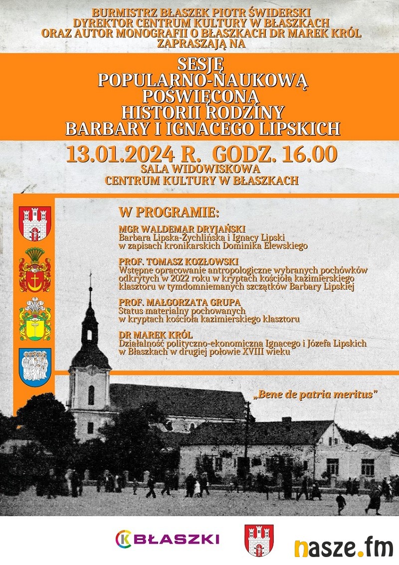 W Centrum Kultury w Błaszkach (pow. sieradzki) zaplanowano na jutro (13.01.br.) sesję popularno - naukową poświęconą historii rodziny Barbary i Ignacego Lipskich. Uważani są oni za założycieli miasta.