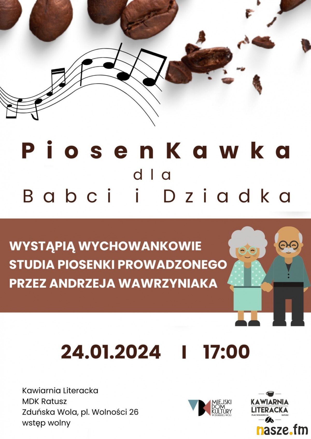 W środę, 24 stycznia, odbędzie się pierwsza w tym roku odsłona PiosenKawki. Wystąpią wokaliści Studia Piosenki prowadzonego przez Andrzeja Wawrzyniaka. Koncert dedykowany jest ukochanym Babciom i Dziadkom. Początek godzina 17:00. Kawiarnia Literacka MDK Ratusz.