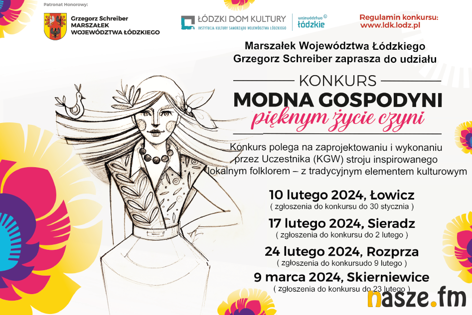 Grzegorz Schreiber - Marszałek Województwa Łódzkiego zaprasza Koła Gospodyń Wiejskich z terenu województwa łódzkiego do wzięcia udziału w dwuetapowym konkursie modowym pn. „Modna gospodyni pięknym życie czyni. Inspiracje dziedzictwem kulturowym województwa łódzkiego”. Konkurs odbędzie się w lutym oraz marcu 2024 r. na terenie Łowicza, Rozprzy, Sieradza, Skierniewic (eliminacje lokalne).