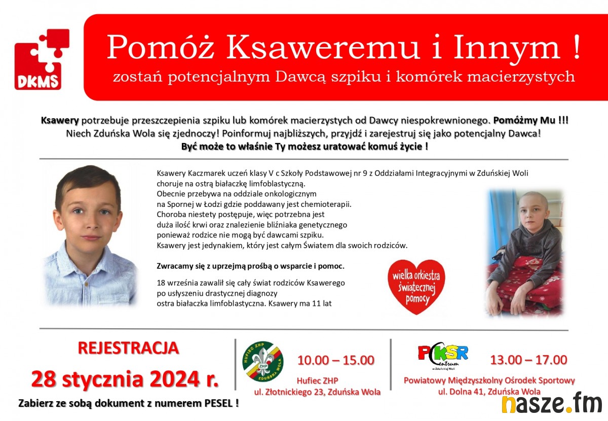 Ksawery Kaczmarek, uczeń klasy V c Szkoły Podstawowej nr 9 z Oddziałami Integracyjnymi w Zduńskiej Woli choruje na ostrą białaczkę limfoblastyczną. Obecnie przebywa na oddziale onkologicznym przy ul. Spornej w Łodzi, gdzie poddawany jest chemioterapii. Choroba niestety postępuje, potrzebna jest duża ilość krwi oraz znalezienie jego bliźniaka genetycznego do przeszczepu szpiku lub komórek macierzystych.