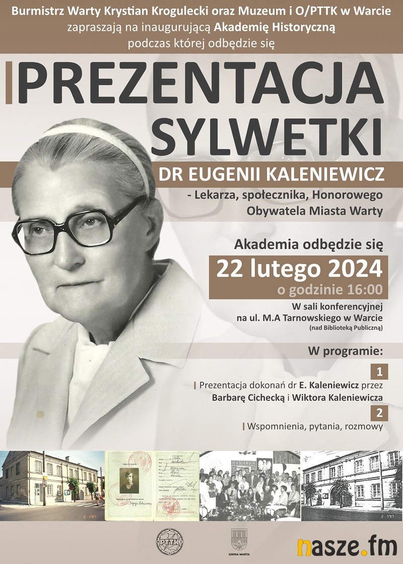 Burmistrz Warty Krystian Krogulecki oraz Muzeum i O/PTTK w Warcie zapraszają na inaugurującą Akademię Historyczną podczas której zaprezentowana będzie sylwetka dr Eugenii Kaleniewicz - lekarza, społecznika, Honorowego Obywatela Miasta Warty. Akademia odbędzie się w dniu 22 lutego godzinie 16.00 w sali konferencyjnej na ul. M.A. Tarnowskiego w Warcie (nad Biblioteką Publiczną)