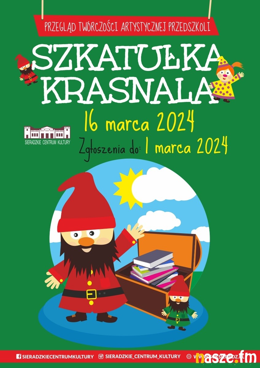 Sieradzkie Centrum Kultury zaprasza dzieci z placówek przedszkolnych z terenu miasta Sieradza do wzięcia udziału w przeglądzie "Szkatułka Krasnala". Zgłoszenia przyjmowane są do 1 marca. Przegląd odbędzie się 16 marca.