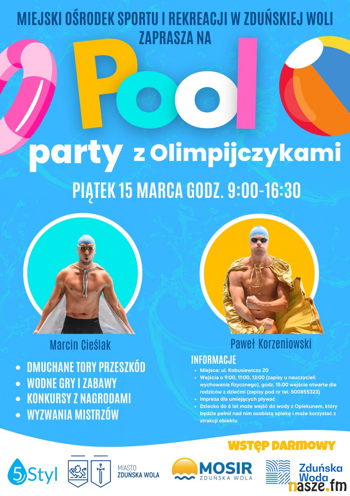 - Uczestnicy wydarzenia przeżyją niezapomnianą przygodę, a basen na czas imprezy zamieniony zostanie w świat wodnej zabawy z torami przeszkód i wyzwaniami oraz warsztatami z mistrzami pływania. Na basenie na uczestników czekają pełni energii trenerzy, w tym olimpijczycy i uznani polscy pływacy, którzy nie tylko pokażą wam jak się pływa, ale rozkręcą całą imprezę - mówi Magdalena Kazek, dyrektor MOSiR-u.