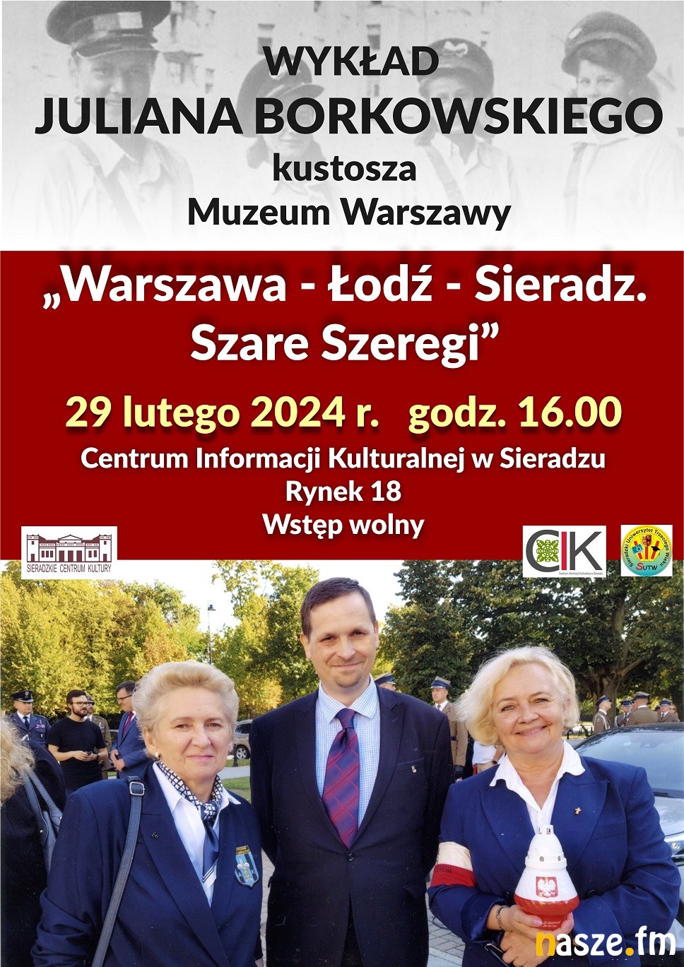 "Warszawa - Łódź - Sieradz. Szare Szeregi" tak zatytułowany jest wykład, który wygłosi jutro w Centrum Informacji Kulturalnej w Sieradzu Julian Borkowski. Spotkanie z kustoszem Muzeum Warszawy zaplanowano na godz. 16:00. Oprócz wykładu zaplanowano też występ grupy wokalnej, działającej przy Uniwersytecie Trzeciego Wieku w Sieradzu.