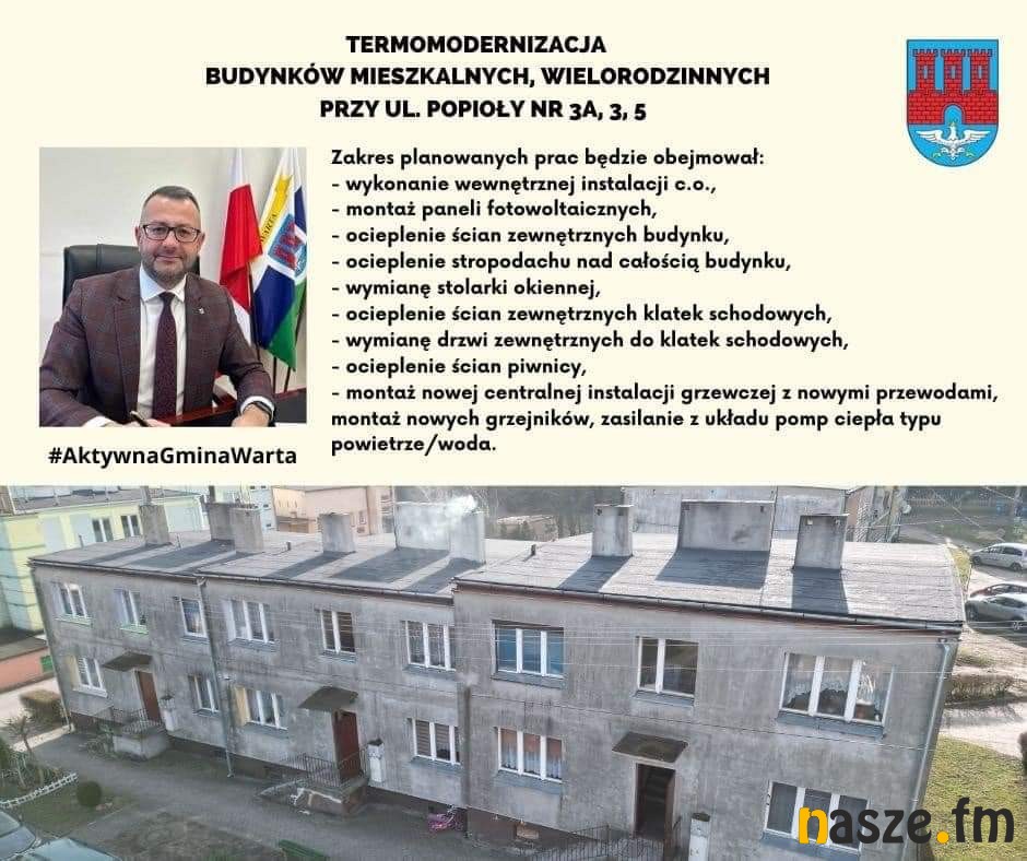 Zadanie dotyczy termomodernizacji budynków mieszkalnych, wielorodzinnych przy ul. Popioły nr 3A, 3 i 5 w Warcie.