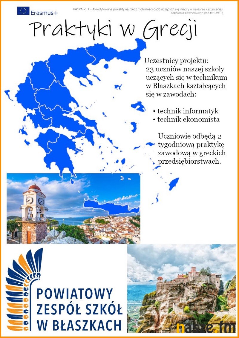 W ramach programu Erasmus + grupa 23 uczniów technikum ekonomicznego i informatycznego w Błaszkach wraz z trzema opiekunami, w dniach 20 - 31.05.2024 r. uczestniczyć będzie w praktykach zawodowych w Grecji.