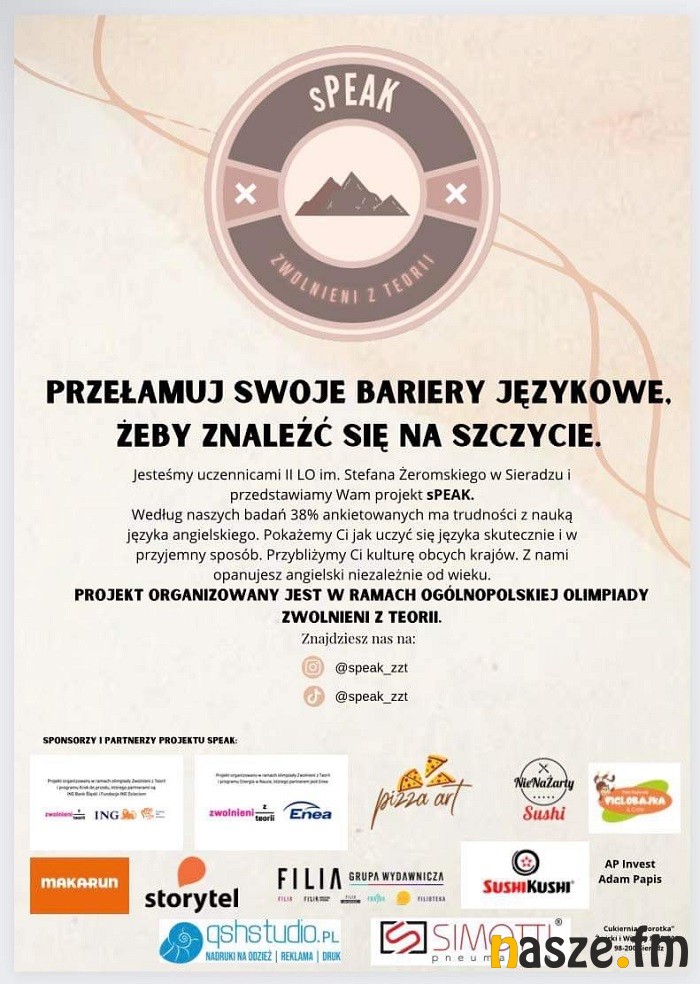 To tytuł projektu, w ramach Olimpiady Zwolnieni z Teorii, który realizują uczennice z II LO z Oddziałami Dwujęzycznymi im. Stefana Żeromskiego w Sieradzu. "sPEAK" to projekt, dzięki któremu każdy niezależnie od wieku pozna kulturę różnych krajów, a przede wszystkim dowie się jak w przyjemny i prosty sposób może się nauczyć języka angielskiego.