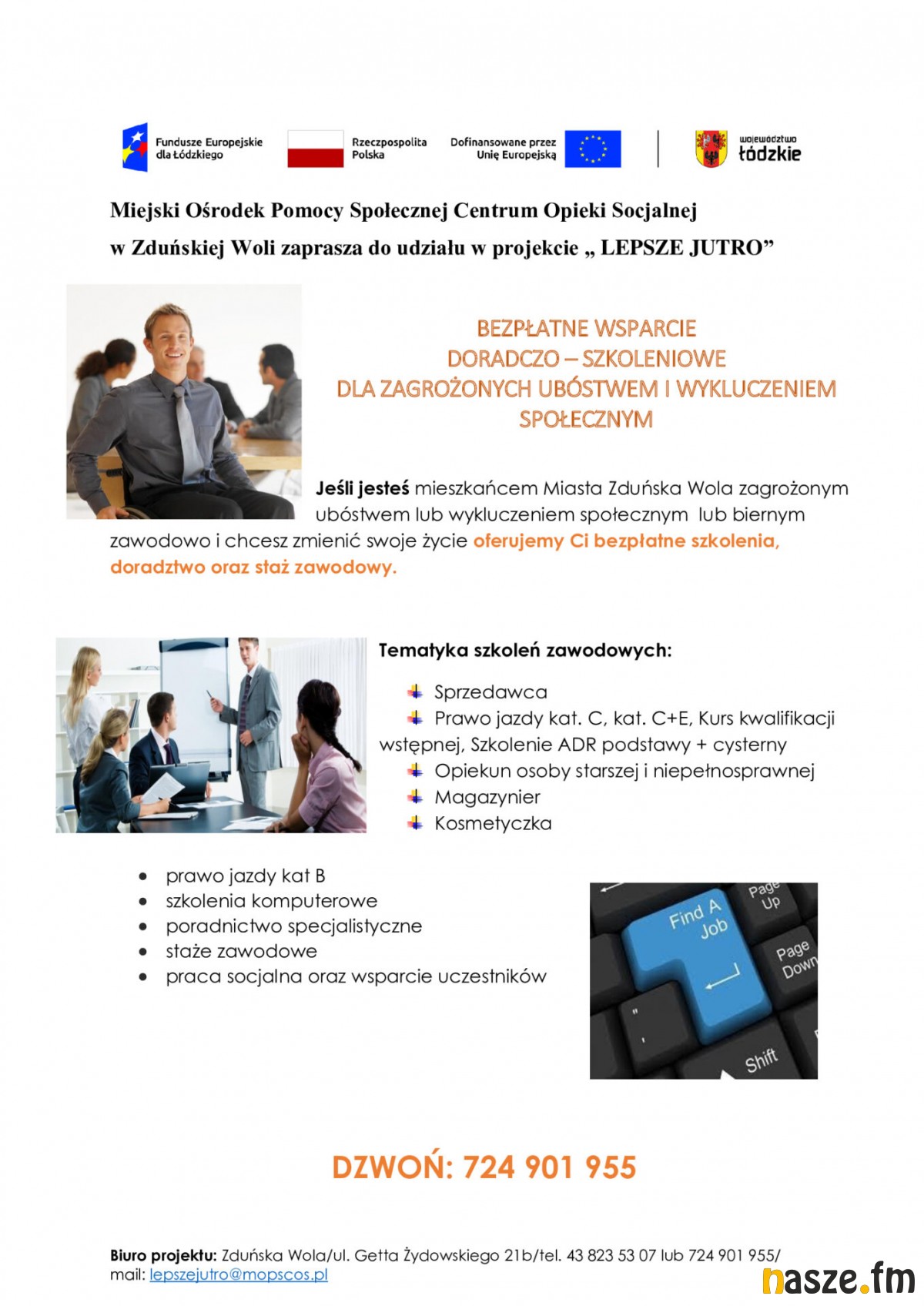 W ramach projektu "Lepsze jutro", realizowanego przez Miejski Ośrodek Pomocy Społecznej Centrum Opieki Socjalnej w Zduńskiej Woli zaplanowano bezpłatne wsparcie dla mieszkańców w postaci m.in. poradnictwa specjalistycznego, treningu kompetencji i umiejętności społecznych, szkolenia komputerowego, diagnostyki i profilaktyki zdrowotnej, prawa jazdy (kat. B, C, C+E), szkoleń zawodowych, staży zawodowych, zasiłków i pomocy w naturze, pracy socjalnej oraz wsparcie towarzyszące dla uczestników i ich otoczenia.