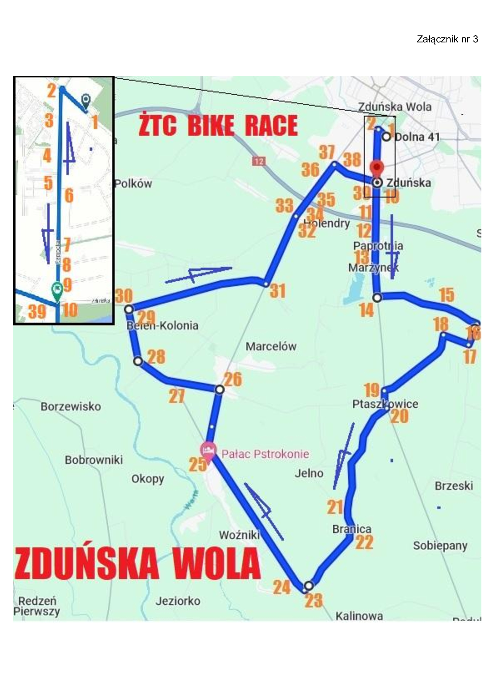 Wyścig wystartuje o 12:00 na ulicy Dolnej przy Powiatowym Międzyszkolnym Ośrodku Sportowym. Zawodnicy przejadą przez ulice: Główną, Paprocką i Podmiejską. Następnie pojadą drogą powiatową przez Marzynek, Młodawin Gorny, Ptaszkowice, Branicę, Rembieszów, Pstrokonie i Zapolice, gdzie kierować się będą w stronę ulicy Sieradzkiej skąd ruszą do Belenia. Następnie pojadą przez Zmyśloną do drogi powiatowej do Zduńskiej Woli. Na koniec trasa wiedzie przez Widawską, Zduńską i Paprocką.