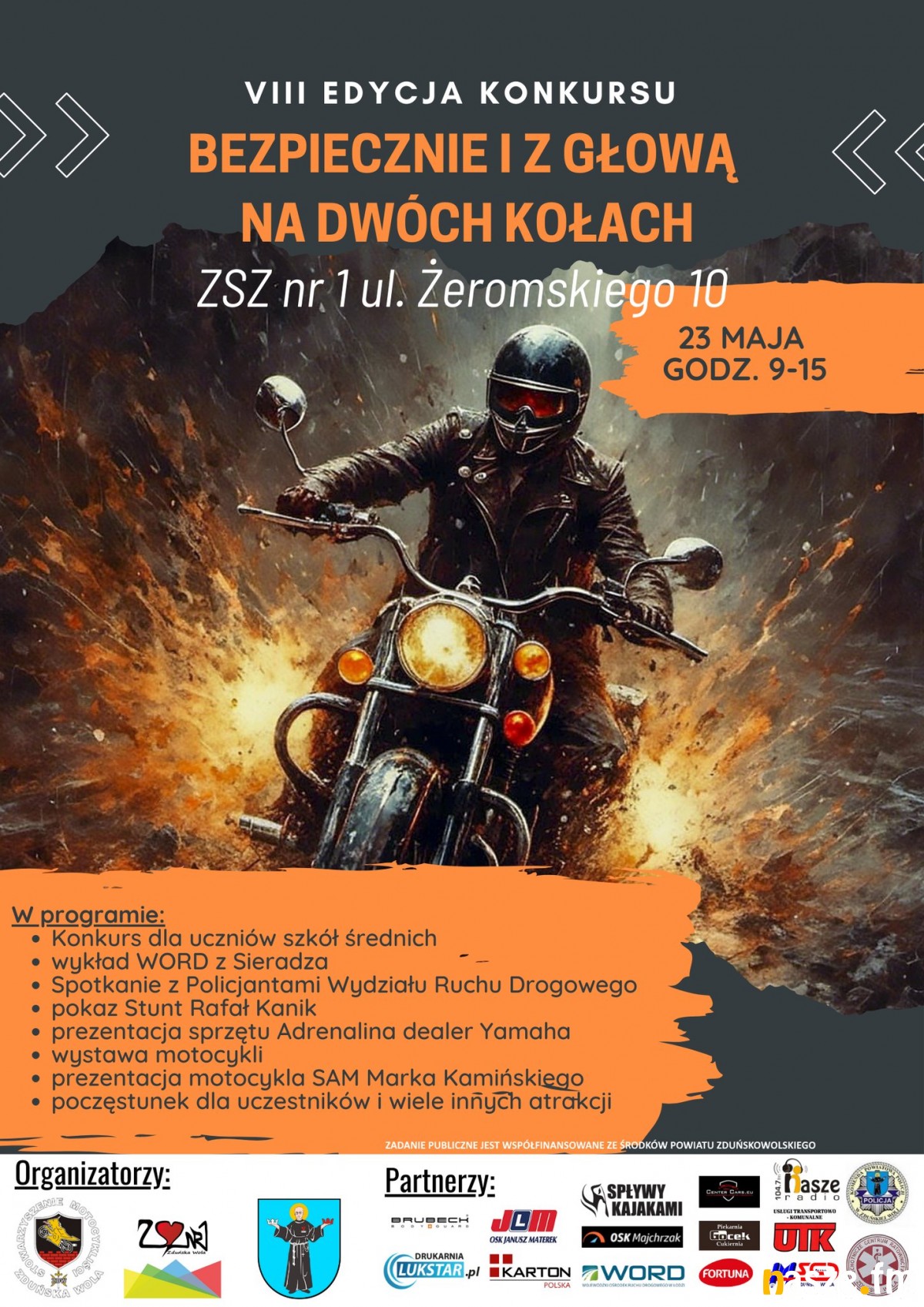 W ramach Dnia Motocykla w czwartek, 23 maja, już po raz ósmy zostanie zorganizowany konkurs "Bezpiecznie i z głową na dwóch kołach". Wydarzenie odbędzie się na terenie Zespołu Szkół Zawodowych nr 1 w Zduńskiej Woli.