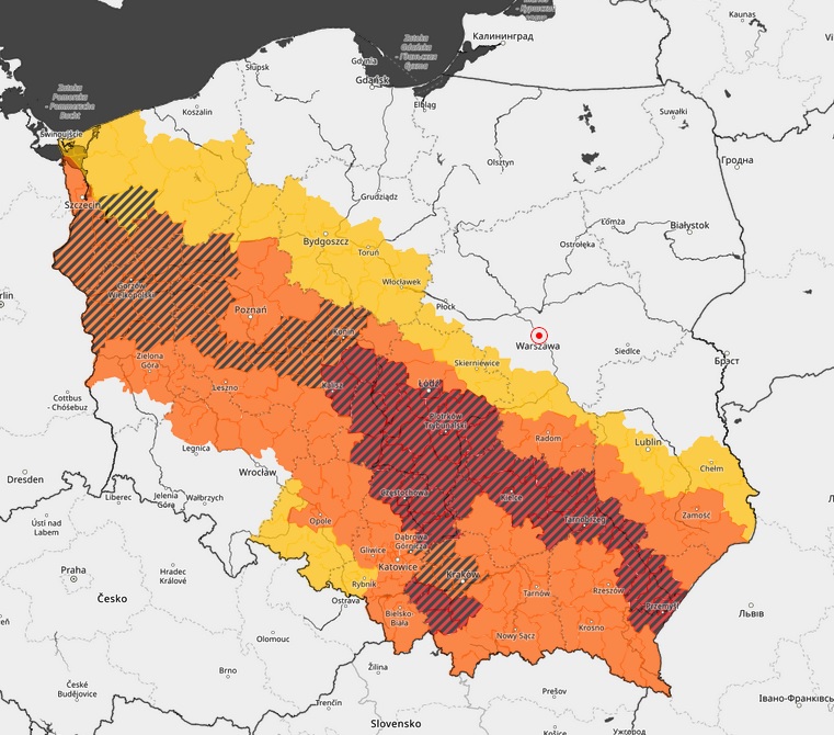 Na mapie poniżej kolorem żółtym zaznaczono obszar naszego kraju objęty ostrzeżeniem pierwszego stopnia, pomarańczowym - drugiego. Kolor czerwony z kreskami oznacza najwyższy, trzeci stopień.