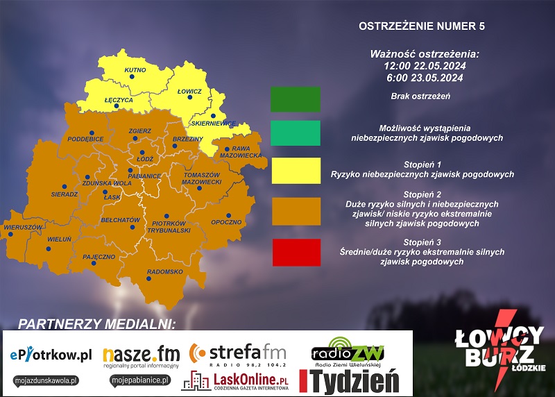 Instytut Meteorologii i Gospodarki Wodnej podniósł stopień ostrzeżenia przed burzami dla powiatów sieradzkiego, zduńskowolskiego i łaskiego z drugiego na trzeci. Dla północnej części Łódzkiego obowiązuje ostrzeżenie pierwszego stopnia. Ostrzeżenie wydali też Łowcy Burz Łódzkie.