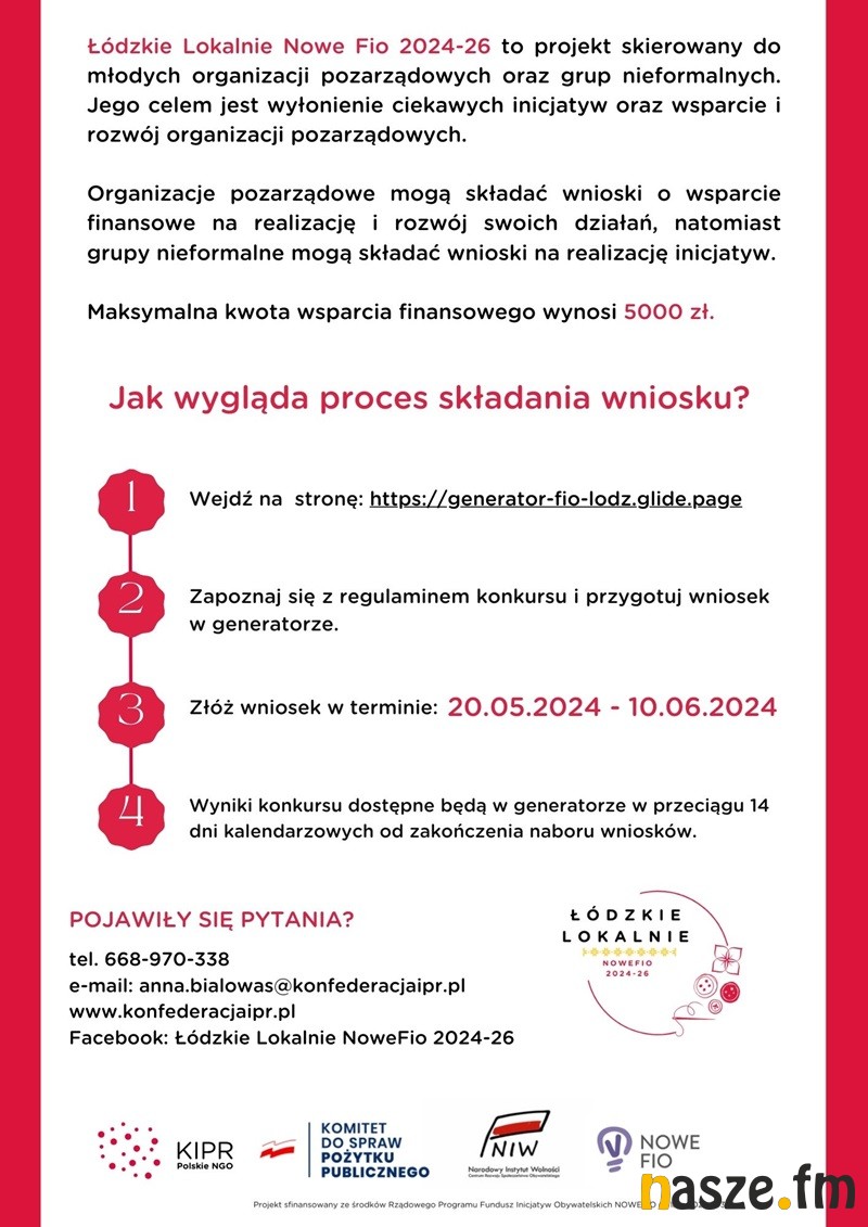 To projekt organizowany przez Związek Stowarzyszeń Konfederacja Inicjatyw Pozarządowych, który zrzesza 150 polskich stowarzyszeń i fundacji. Na co dzień zajmujemy się wspieraniem naszych członków, ale realizujemy też szereg własnych projektów np. Łódzkie Lokalnie Nowe Fio 2024-26. Jest to inicjatywa mająca na celu wspieranie młodych organizacji pozarządowych i grup nieformalnych poprzez dofinansowanie ich projektów oraz wspieranie rozwoju organizacji pozarządowych w regionie łódzkim.