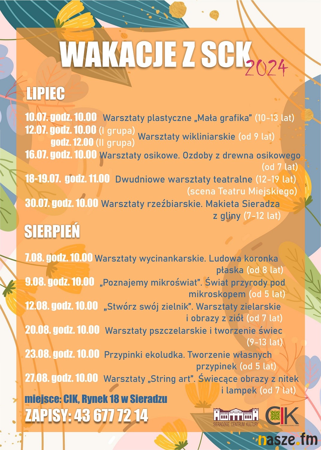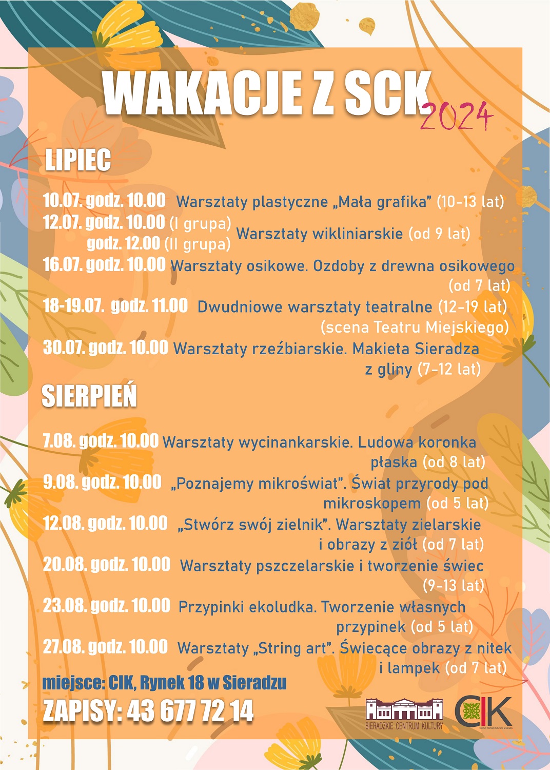 Sieradzkie Centrum Kultury zaprasza na bezpłatne zajęcia wakacyjne dla dzieci. Zajęcia będą odbywać się w Centrum Informacji Kulturalnej w Sieradzu, Rynek 18. Na warsztaty obowiązują zapisy, nr tel. 43 677 72 14.