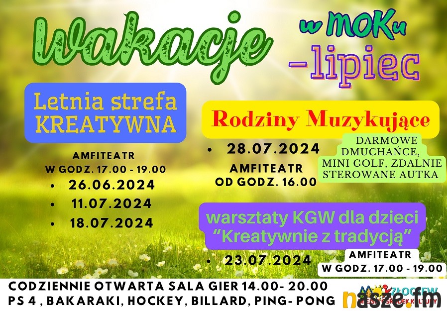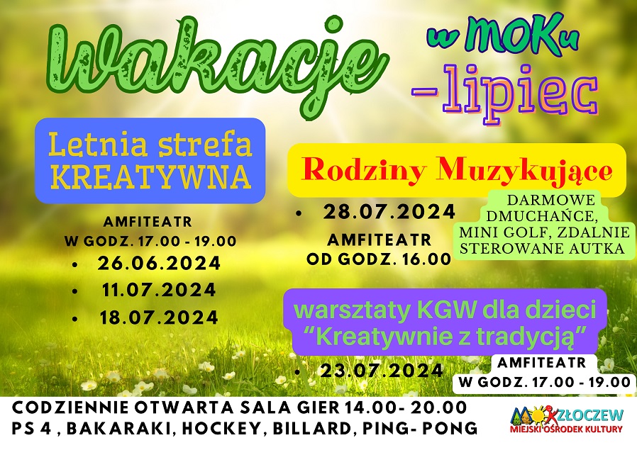 Letnią Strefę Kreatywną, która odbędzie się 26.06. 11.07 i 18.07 w amfiteatrze w godz. 17.00 - 19.00. Warsztaty dla dzieci organizowane wspólnie z KGW "Kreatywnie z tradycją" 23.07 w amfiteatrze w godz. 17.00 - 19.00 oraz 28.07. Rodziny Muzykujące również w amfiteatrze od godz. 16.00, podczas których dla dzieci dostępne będą darmowe dmuchańce, mini golf i zdalnie sterowane autka. Ponadto w MOKu codziennie dostępna jest sala gier wyposażona w ps4, tenisa stołowego, bilarda, hockeya i bakaraki.