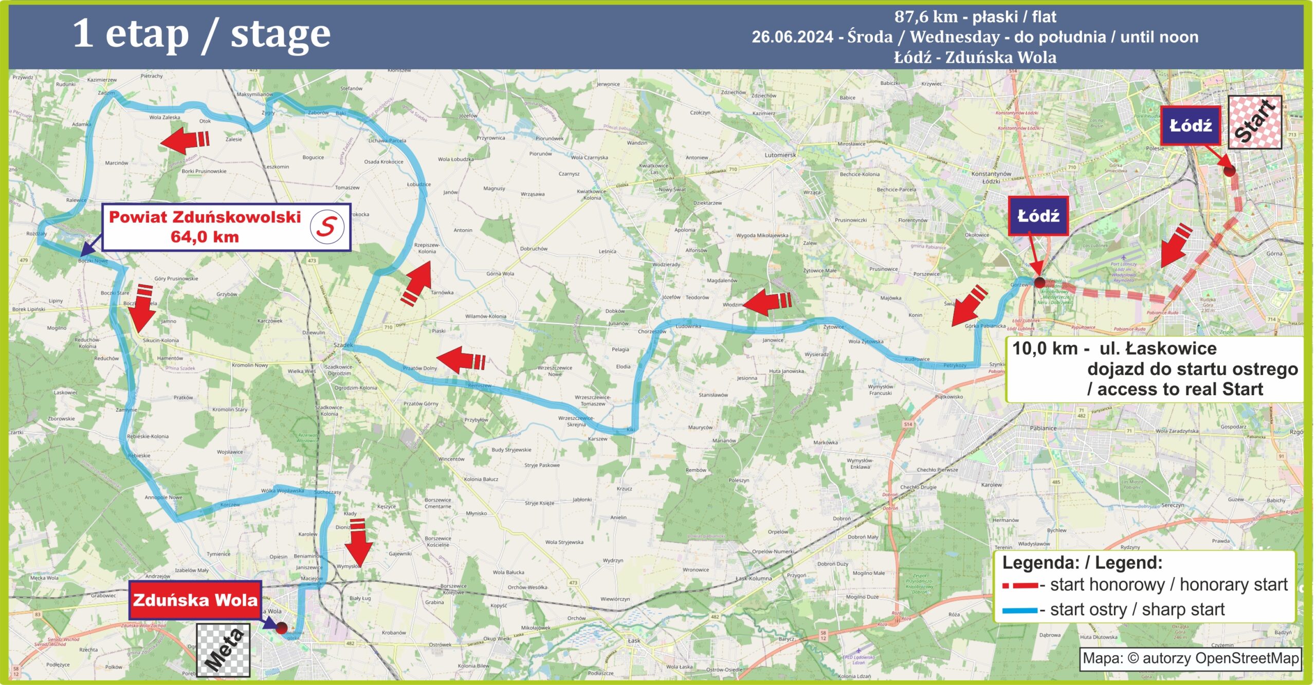Kolarze wystartują w Łodzi, a następnie przejadą przez powiaty: pabianicki, łaski i poddębicki. Około 11:15 zawodnicy pojawią się w Szadku. Potem przejadą przez: Zygry, Zadzim, Annopole Stare, Izabelów, Tymienice, Korczew, Suchoczasy i Ochraniew. W Zduńskiej Woli będą około godziny 12:30. Z ulicy Szadkowskiej pojadą Spacerową i Łaską,. Przy Zespole Szkół Elektronicznych będzie meta. Dekoracja najlepszych zawodników nastąpi około 13:00. Trasa pierwszego etapu liczy 87,6 km.