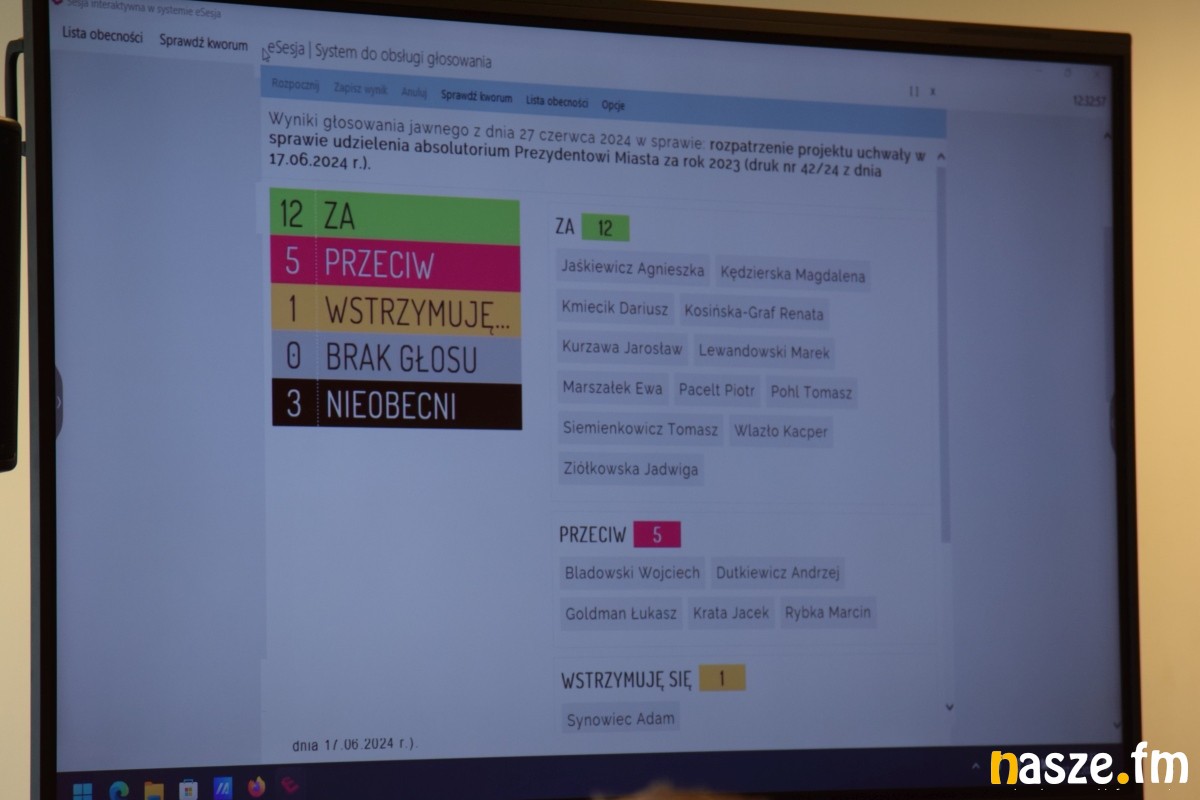 Sprawozdania finansowe miasta na 2023 roku zostały przyjęte przez radnych bez dyskusji, ale głosowanie nie było jednomyślne. Za absolutorium zagłosowało 12 radnych, 5 było przeciw, 1 radny wstrzymał się od głosu, a 3 radnych było nieobecnych podczas głosowania.