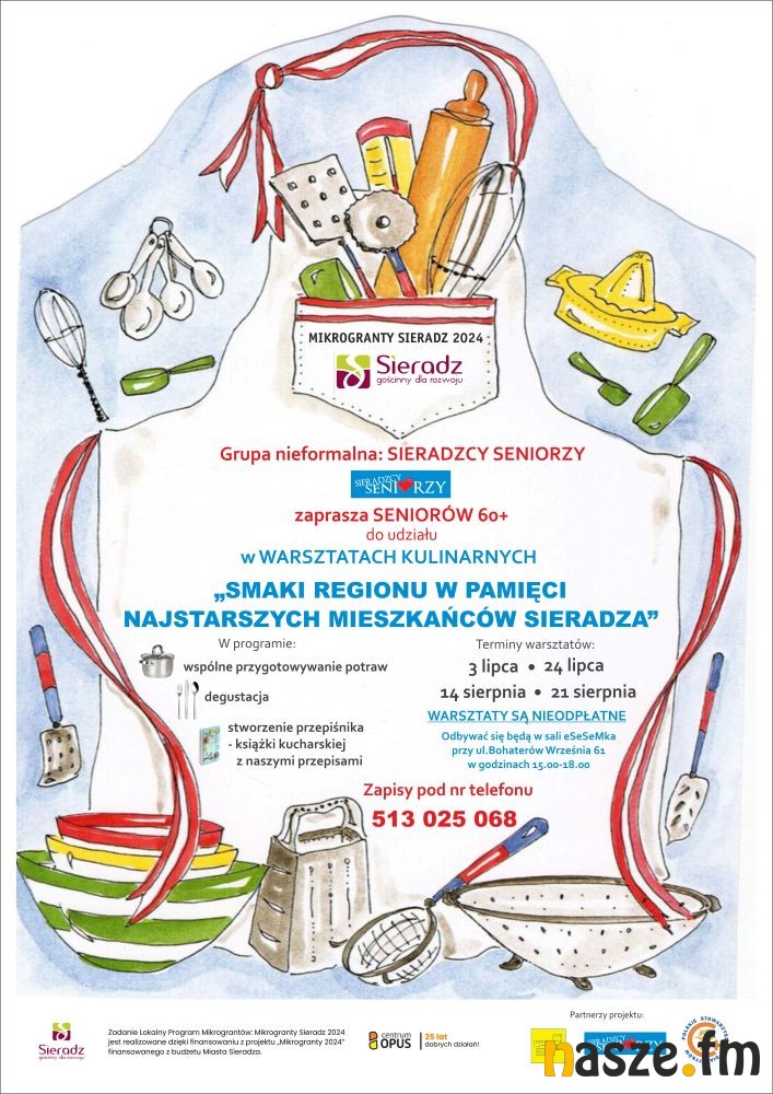 Sieradzcy Seniorzy zapraszają na warsztaty kulinarne Smaki regionu w pamięci najstarszych mieszkańców Sieradza w ramach środków pozyskanych z programu realizowanego przez Miasto Sieradz i Centrum OPUS Mikrogranty Sieradz 2024.
