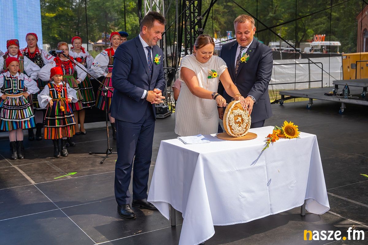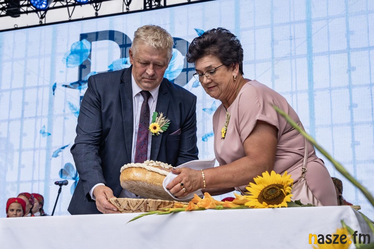 Po mszy barwny korowód prowadzony przez Orkiestrę Dętą z OSP Zawada przeszedł pod scenę, gdzie rozpoczęła się ceremonia obrzędowa. Starostowie dożynek: Ewa Liźniewicz i Dariusz Pawlik, rolnicy z gminy Inowódz, przekazali chleb dożynkowy marszałek Joannie Skrzydlewskiej i wicemarszałkowi Piotrowi Wojtysiakowi, a oni częstowali nim uczestników święta plonów.