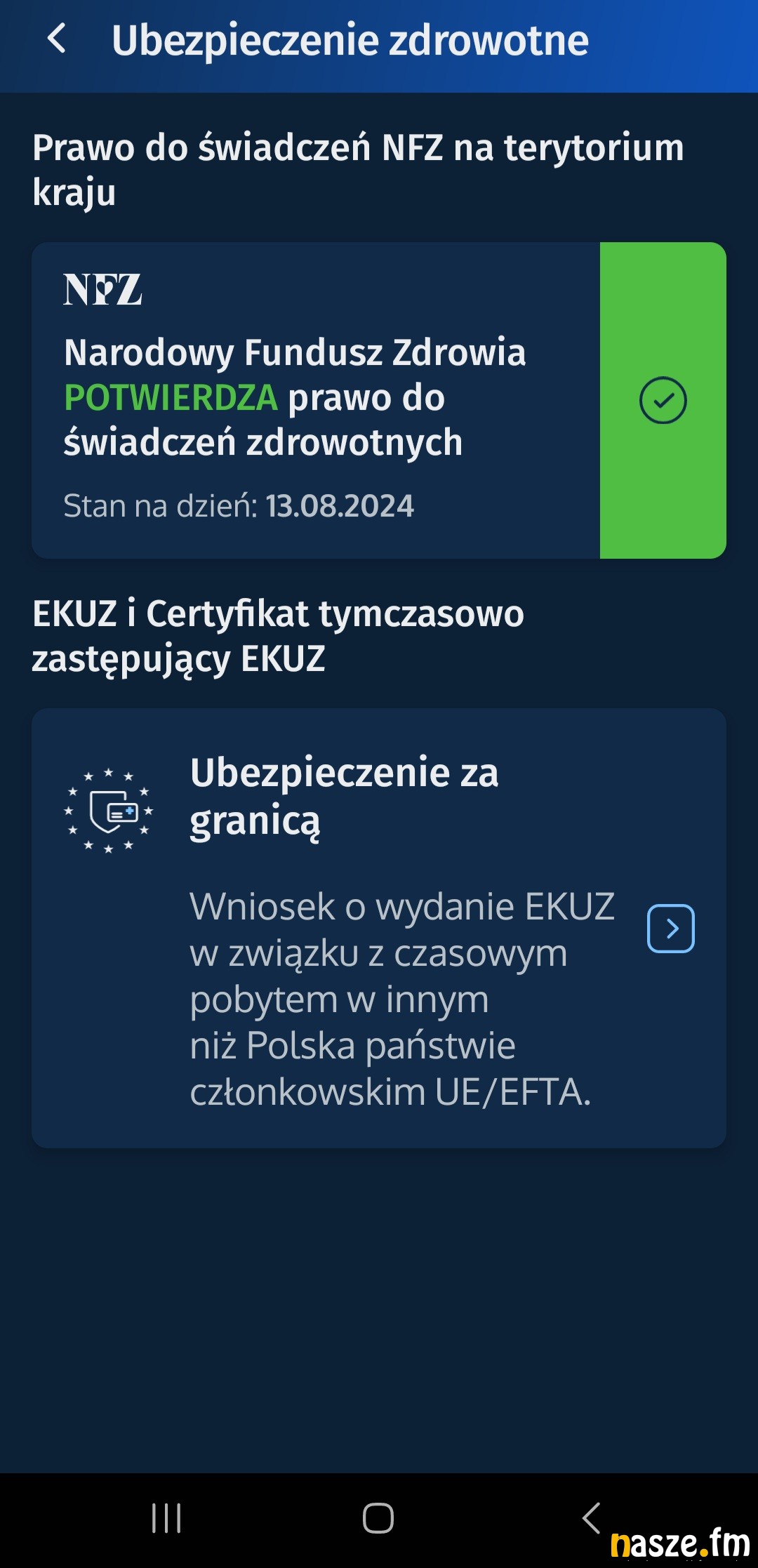 - pozwala szybko sprawdzić Twoje prawo do świadczeń w ramach Narodowego Funduszu Zdrowia (NFZ)