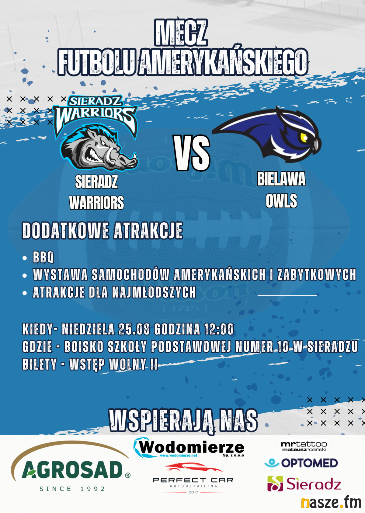 W niedzielę na boisku Szkoły Podstawowej nr 10 w Sieradzu odbędzie się mecz futbolu amerykańskiego, podczas którego drużyna Sieradz Warriors zagra z Bielawa Owls. Gospodarze zadbali też o dodatkowe atrakcje. Początek wydarzenia o godzinie 12:00.