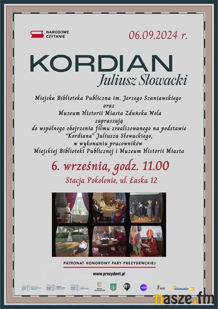 O godz. godz. 11.00 w Stacji Pokolenie w bibliotece przy ul. Łaskiej 12, obejrzeć będzie można realizację filmową na podstawie arcydzieła polskiej literatury - "Kordiana" autorstwa Juliusza Słowackiego z udziałem pracowników Miejskiej Biblioteki Publicznej oraz Muzeum Historii Miasta.