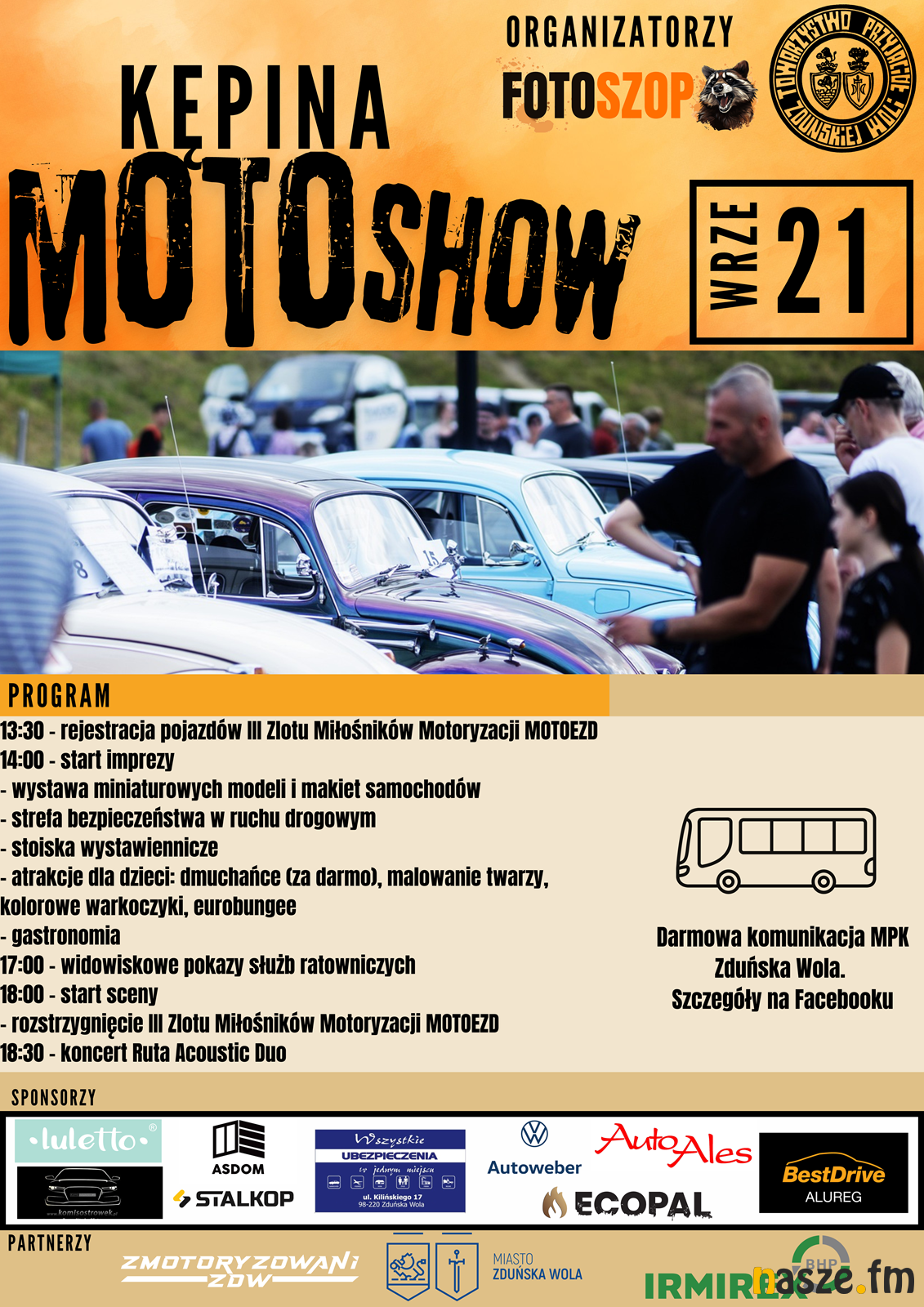 Sekcja Miłośników Motoryzacji Towarzystwa Przyjaciół Zduńskiej Woli wspólnie z Agencją Reklamową Fotoszop Błaszki zapraszają na wyjątkowe wydarzenie plenerowe "Kępina Moto Show". W sobotę, 21 września, nad zbiornikiem wodnym Kępina w Zduńskiej Woli królować będzie szeroko pojęta motoryzacja.
