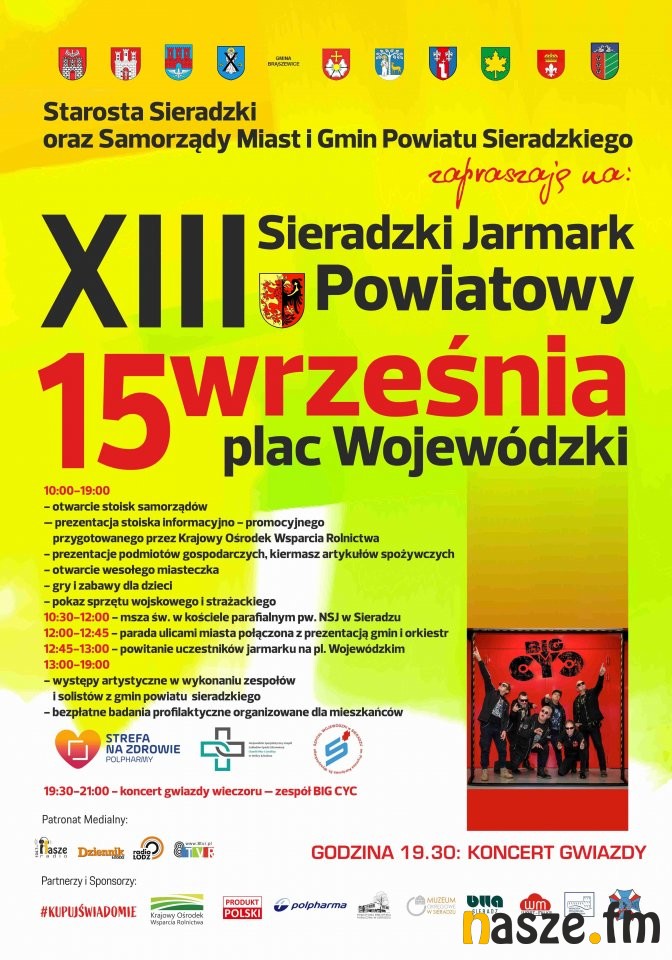 Decyzja ta zapadła głównie z uwagi na niesprzyjające warunki atmosferyczne, które nie gwarantują komfortowego i bezpiecznego przeprowadzenia imprezy. Jak dziś poinformowała Nasze Radio Małgorzata Jurkowska, członek zarządu Powiatu Sieradzkiego na jarmark na pl. Wojewódzkim w Sieradzu będzie można wybrać się w przyszłym roku. Imprezę uświetni planowany na niedzielę 15.09. koncert zespołu Big Cyc.