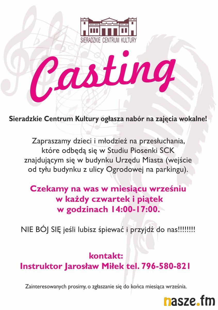 Sieradzkie Centrum Kultury ogłasza nabór na zajęcia wokalne prowadzone przez instruktora Jarosława Miłka. Zaproszenie skierowane jest do dzieci i młodzieży. Przesłuchania odbywają się w każdy czwartek i piątek września.