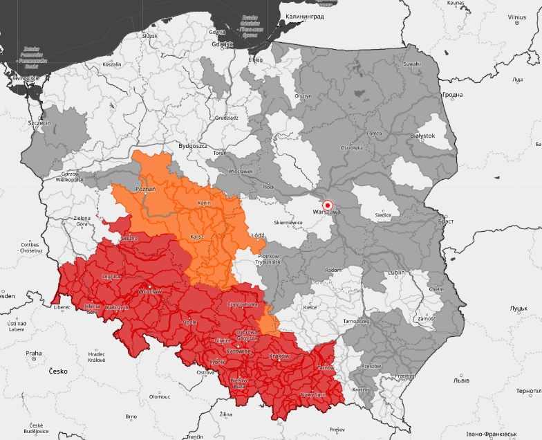 Na mapie poniżej kolorem pomarańczowym zaznaczono obszar, na którym obowiązuje ten stopień ostrzeżenia. Czerwonym - najwyższego, trzeciego.