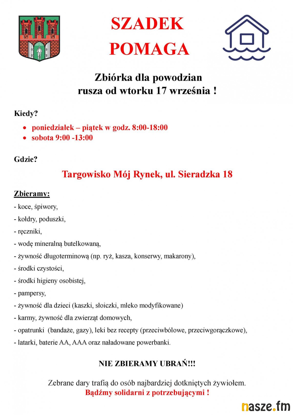 Ich grupy terenowe opuszczą teren naszego województwa i udadzą się w rejony, gdzie pomoc jest niezbędna. Możecie też wesprzeć ich inicjatywę finansowo, link do zbiórki znajdziecie TUTAJ. Środki zebrane podczas zbiórki Łowcy przeznaczą na zakupy materiałów, które według wytycznych sztabów kryzysowych są niezbędne (koce, woda, niepsujące się jedzenie).Gmina SieradzW tej części regionu dary dla powodzian można składać we wszystkich jednostkach Ochotniczych Straży Pożarnych. Przyjmują je także szkoły podległe gminie. Potrzebna jest głównie woda pitna, środki czystości oraz karma dla zwierząt. Mile widziane są ponadto szczotki, łopaty i szpadle. W Urzędzie Gminy Sieradz pracownicy zebrali 3 tys. zł, za które będą kupione dary. Zbiórka na terenie gminy będzie prowadzona do momentu, gdy dary zapełnią naczepę tira. Wtedy transport pojedzie do potrzebujących pomocy. Najprawdopodobniej będzie to Lądek - Zdrój w woj. dolnośląskim.