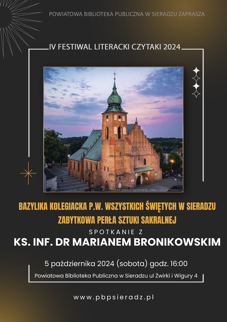 W sobotę o godz. 16.00 w bibliotece przy ul. Żwirki i Wigury w Sieradzu odbędzie się spotkanie "Bazylika kolegiacka p.w. Wszystkich Świętych w Sieradzu - zabytkowa perła sztuki sakralnej", gościem będzie ks. inf. dr Marian Bronikowski.- Zabierzemy Państwa do wnętrza sieradzkiej Bazyliki Mniejszej, o której opowie jej największy współczesny orędownik ks. inf. dr Marian Bronikowski. Sieradzka Kolegiata otworzy się przed nami z zabytkowej strony, to spotkanie pełne historii, opowieści o tym wyjątkowym dziedzictwie - zachęcają do udziału bibliotekarze.