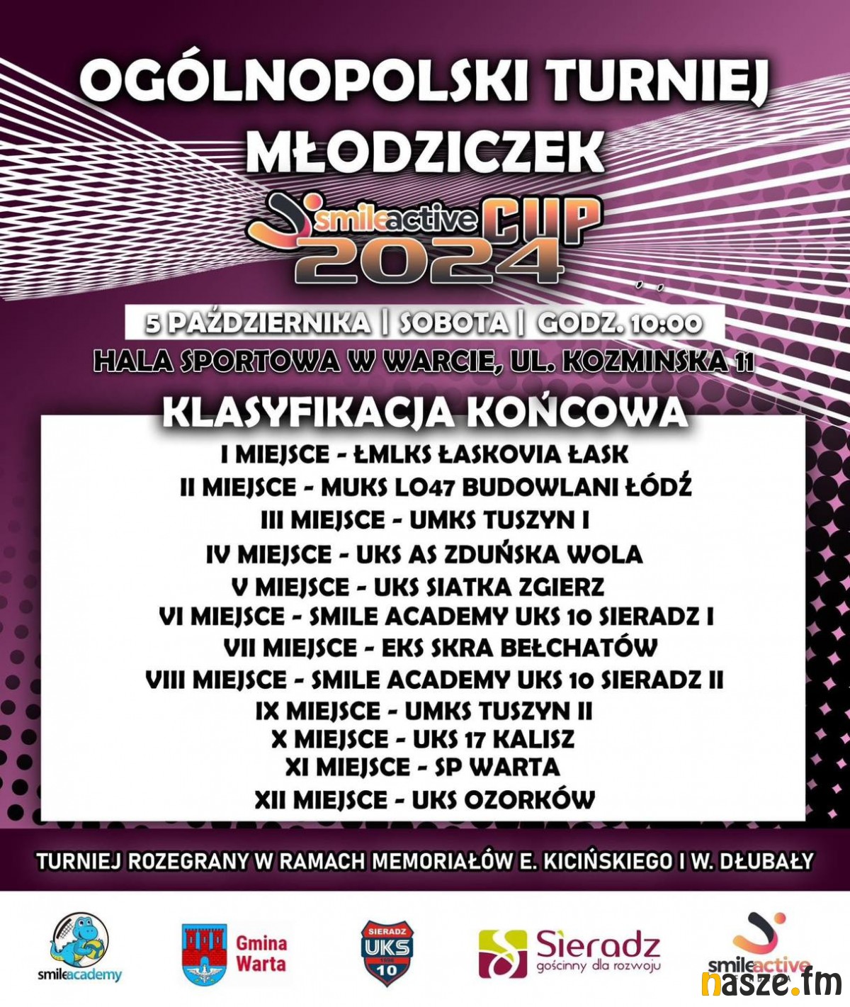 Wczoraj w hali sportowej w Warcie odbył się II Ogólnopolski Turniej w Piłce Siatkowej SMILE ACTIVE CUP 2024 w kat. Młodziczka. Turniej został rozegrany w ramach XXXII Memoriału Erazma Kicińskiego i XXI Memoriału Wiktora Dłubały.