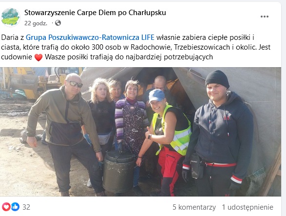 Daria z Grupa Poszukiwawczo-Ratownicza LIFE właśnie zabiera ciepłe posiłki i ciasta, które trafią do około 300 osób w Radochowie, Trzebieszowicach i okolic. Jest cudownie. Wasze posiłki trafiają do najbardziej potrzebujących.