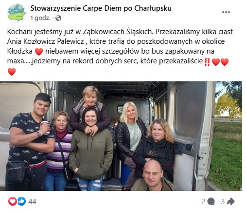 - Wydajemy posiłki dla żołnierzy i licznych wolontariuszy. Pierwsze dary przekazaliśmy w Ząbkowicach Śląskich, które trafią w okolice Kłodzka. Zgłaszają się do nas okoliczne sztaby, które zabiorą posiłki dla żołnierzy z różnych części Ziemi Kłodzkiej, którzy pracują w pocie czoła usuwając szkody po ogromnej powodzi. Mamy kapuśniak, ogórkową, żurek, gulasz, a nawet schabowe i pierogi. Domowe ciasta rozchodzą się w gigantycznym tempie. Kaszubi dowieźli skrzynkę domowej kiełbasy, którą rozdajemy mieszkańcom - relacjonuje prezes Stowarzyszenia Carpe Diem po Charłupsku.
