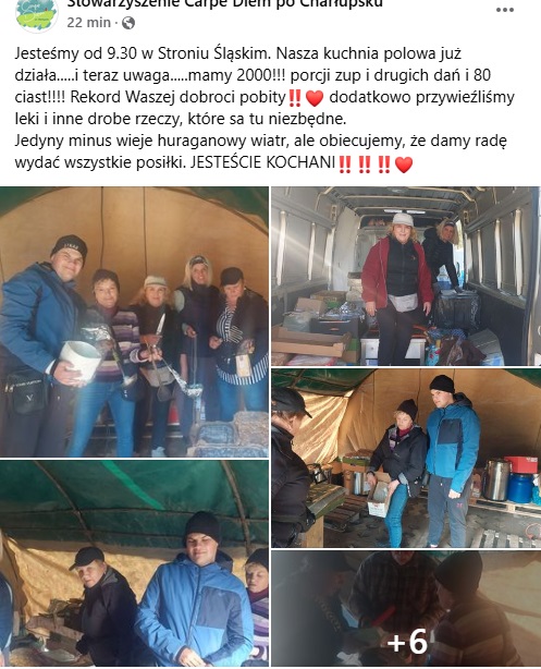 Dawid Zawiasa wczoraj informował, że tym razem udało się zebrać rekordową ilość 2000 ciepłych posiłków i 80 ciast. To wszystko przyjechało do Stronia Śląskiego i teraz jest rozdawane przez wolontariuszy z naszego regionu.