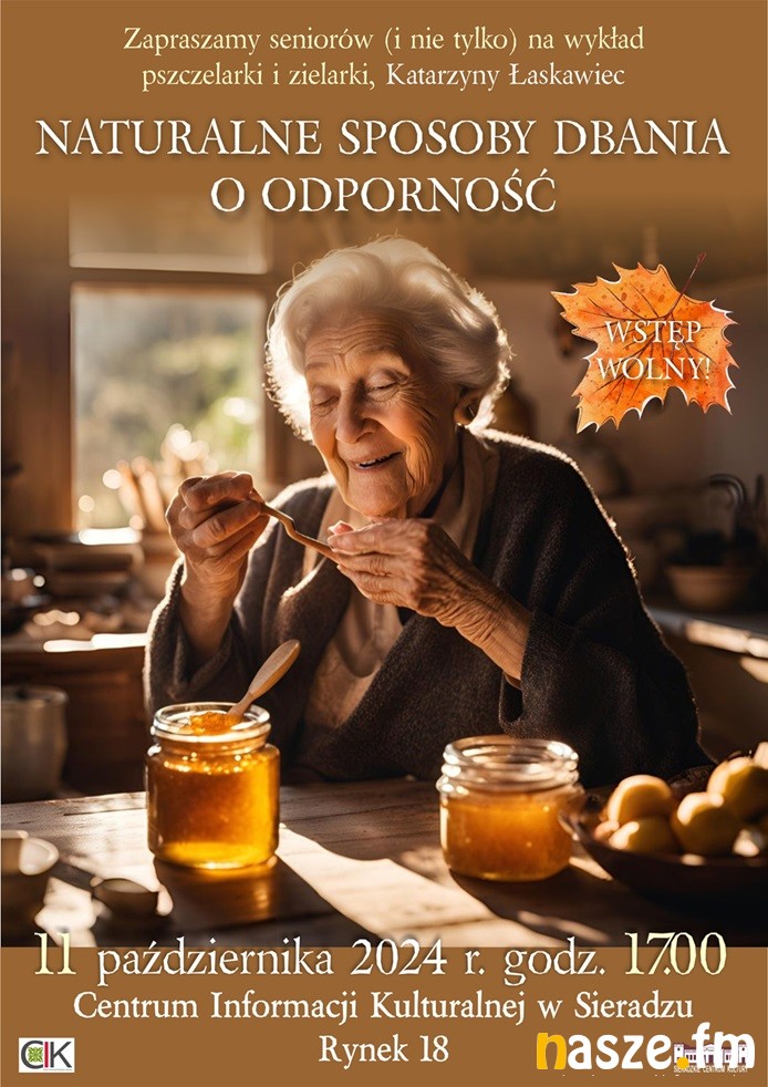 - Pomimo początku jesieni już obserwujemy liczne infekcje. Natura wokół dostarcza nam wielu składników, które wspierają nasz organizm, a nawet posiadają właściwości lecznicze. Trzeba jednak wiedzieć po co sięgnąć i jak używać tego, co oferuje nam przyroda. O tym, jak zachować zdrowie jesienią, opowie pani Katarzyna, której praca jest jednocześnie pasją i sposobem na życie. Na co dzień mieszka w Gaszynie pod Wieluniem, prowadząc "Pasiekę na Źródłach" - zachęcają do udziału organizatorzy.