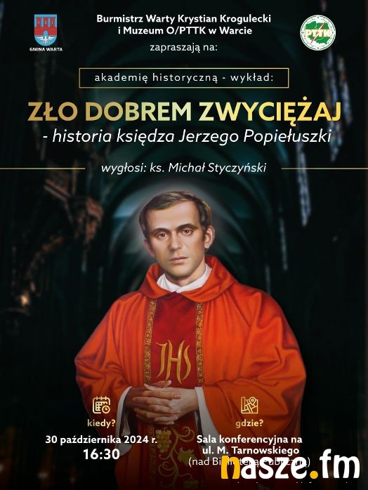 Dziś w Warcie odbędzie się kolejna akademia historyczna. Tym razem wykład „Zło dobrem zwyciężaj - historia księdza Jerzego Popiełuszki” wygłosi: ks. Michał Styczyński. Początek o godzinie 16:30, wstęp wolny.