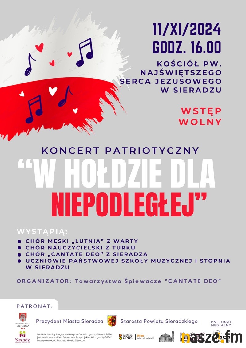 Towarzystwo Śpiewacze "Cantate Deo" z Sieradza zaprasza miłośników pieśni chóralnej i muzyki patriotycznej na koncert pt. "W hołdzie dla Niepodległej". Koncert odbędzie się 11 listopada w kościele p.w. Najświętszego Serca Jezusowego w Sieradzu.