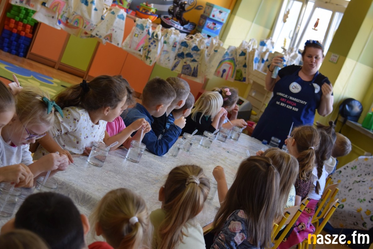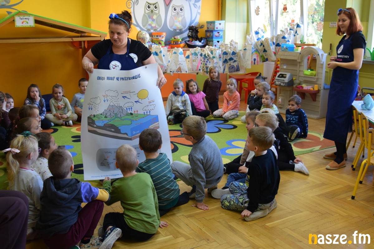 Elementem nauki było wytłumaczenie jak będzie zbierana deszczówka w ich przedszkolu i jak wodę spadającą z nieba można będzie wykorzystać. Animatorki pokazały jaki jest cykl obiegu wody w przyrodzie, a dzieci mogły same zobaczyć jak skrapla się deszcz i przenika przez chmury podczas eksperymentu z niebieskim barwnikiem. Przedszkolaki przygotowały także ekotorby, które same ozdobiły deszczowymi malunkami.