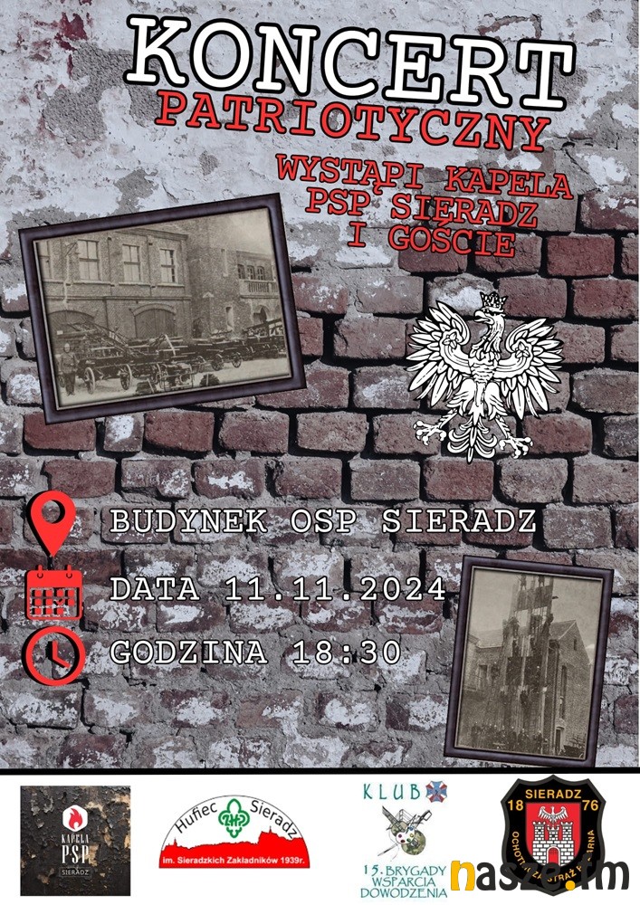 Jak co roku sieradzka Kapela PSP zagra koncert pieśni patriotycznych z okazji Święta Niepodległości. To już tradycja, ale też i muzyczna lekcja historii. Usłyszymy pieśni które towarzyszyły naszym żołnierzom na różnych frontach. Koncert rozpocznie się o godz. 18:30 w sali widowiskowej Ochotniczej Straży Pożarnej w Sieradzu.
