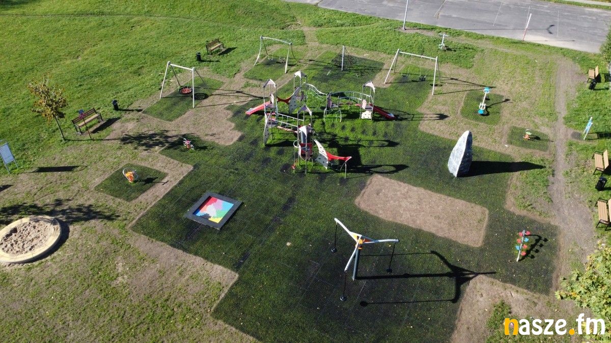 Zadaniem wykonawcy prac było także naprawienie urządzeń, jakie wcześniej były na placu zabaw. To między innymi huśtawka oraz system urządzeń do zabawy ze zjeżdżalniami w centralnej części placu.